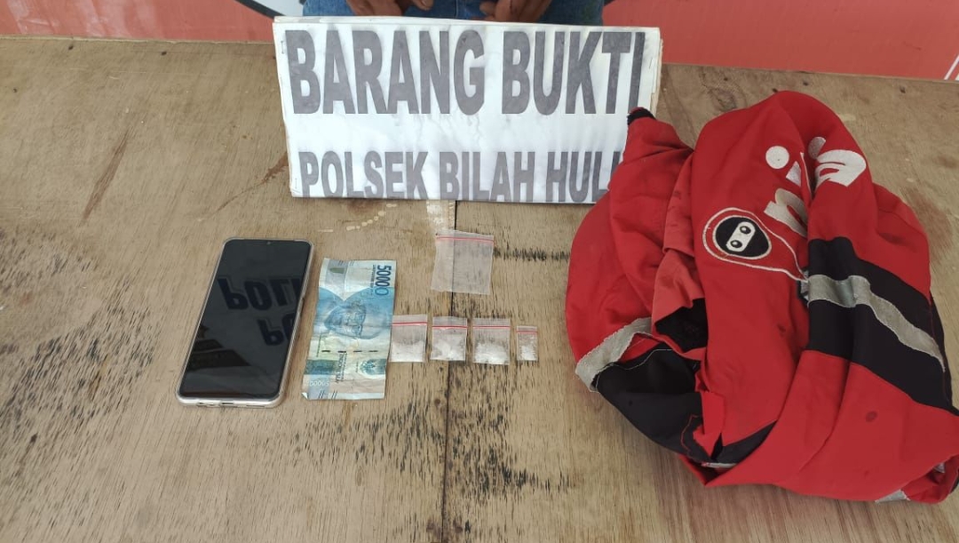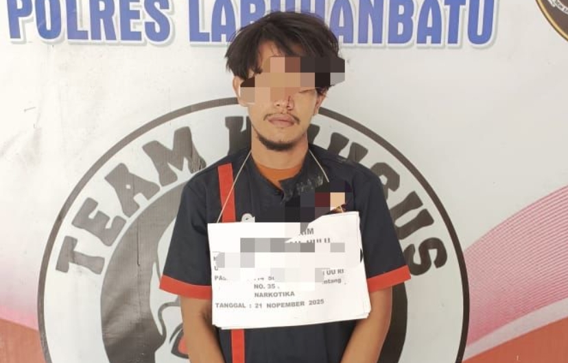 Terduga pelaku penyalahgunaan narkotika ini harus bertekuk lutut diringkus unit Reskrim Polsek Bilah Hulu di Jalan Lintas Dusun Simpang Rintis, Desa Lingga Tiga, Kecamatan Bilah Hulu pada Jum’at (21/11/2025).